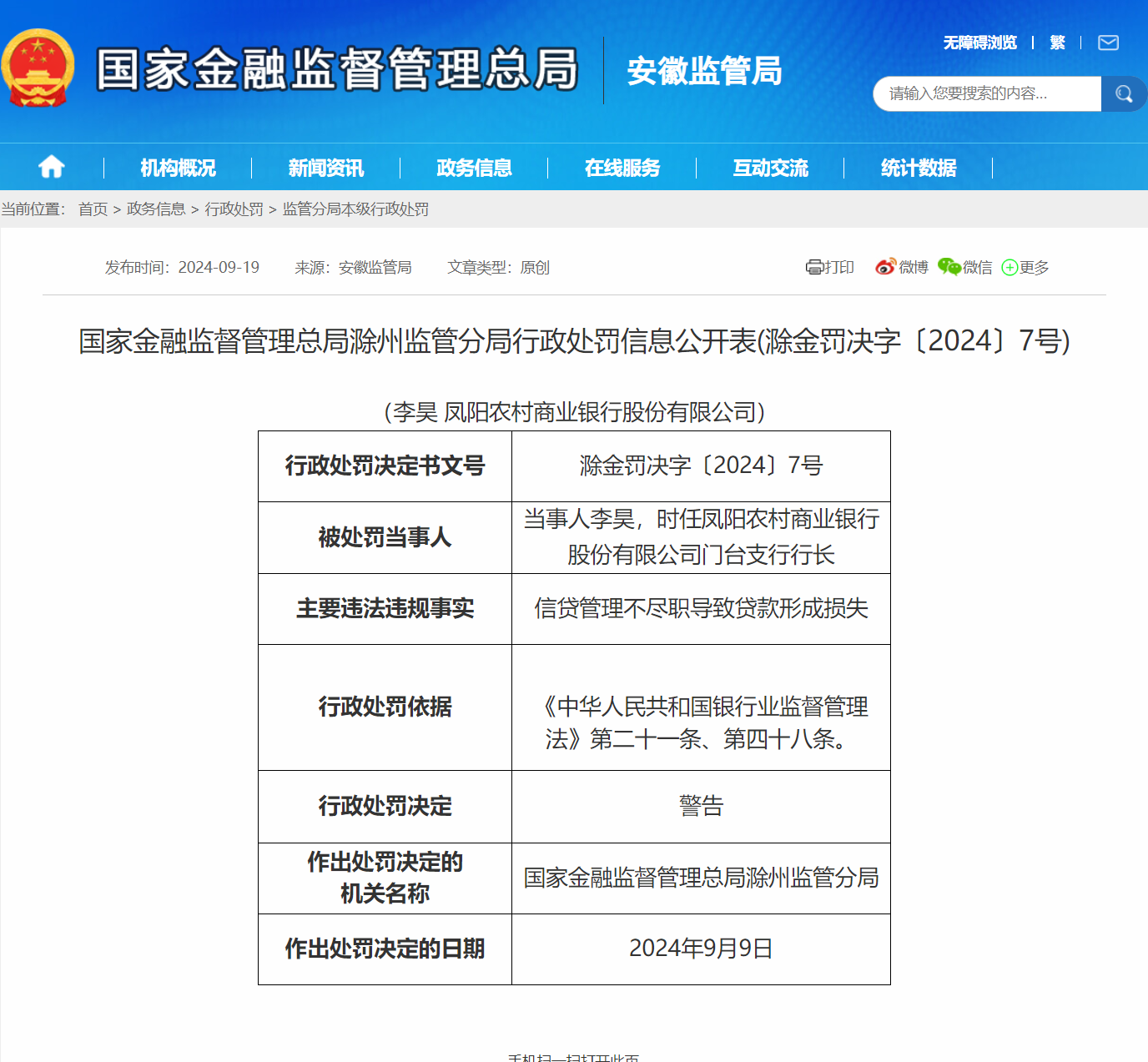 时任凤阳农村商业银行股份有限公司门台支行行长李昊,主要违法违规事实为信贷管理不尽职导致贷款形成损失,被警告处分。