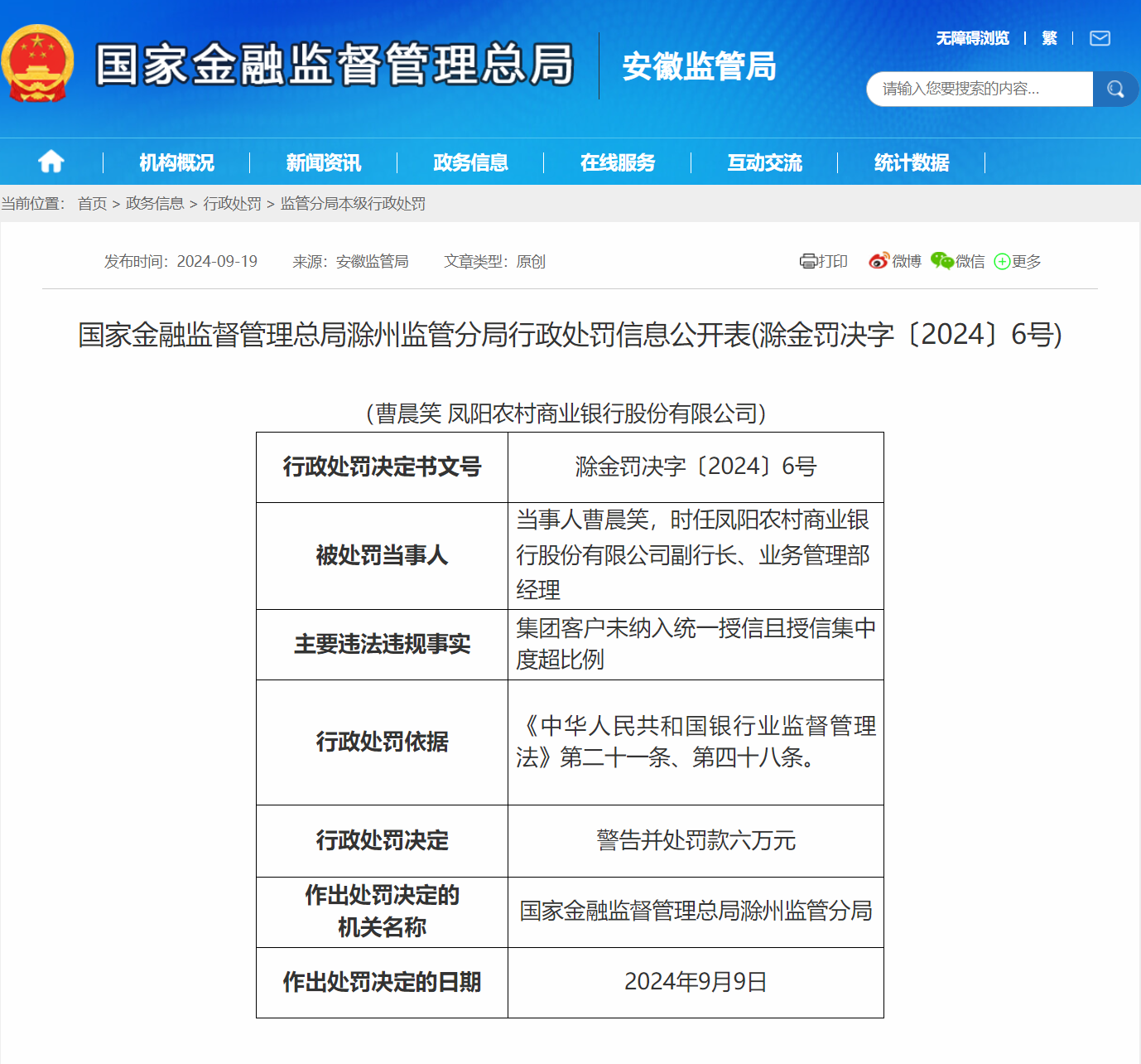 此外,时任凤阳农村商业银行股份有限公司副行长、业务管理部经理曹晨笑,主要违法违规事实为集团客户未纳入统一授信且授信集中度超比例,被警告并处罚款6万元。