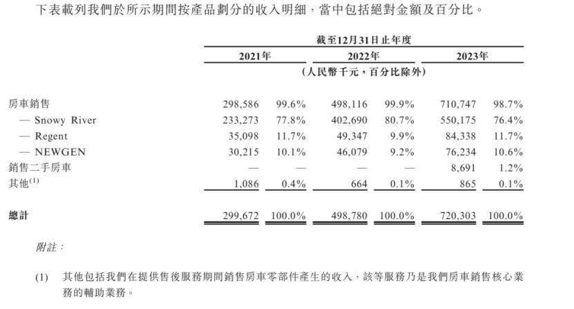 2021年-2023年,新吉奥的房车销售收入占比均超98%,是公司主要销售收入。除销售房车,截至2023年底,公司还有54家房车维修车间,提供包括房车保养、维修、零部件及配件的销售和升级。此外,公司还销售二手房车。