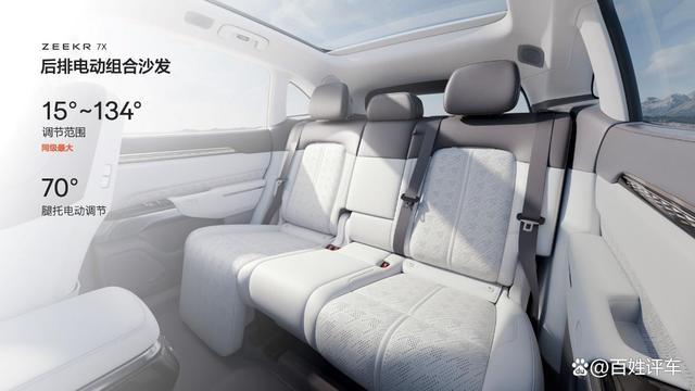 为响应用户对于二排豪华配置的需求,极氪7X提供了后排座椅套装和后排屏幕套装,用百万级的电动沙发体验,为SUV实现“豪华升舱”。在后排座椅套装内,极氪7X的后排座椅采用了与极氪009相同的NAPPA全粒面头层真皮,拥有同级唯一的电动滑轨,215mm前后滑动距离,连体式腿托,联动拥有15°~134°同级最大调节范围的靠背,带来最舒展的躺平角度,还拥有6向电动调节,通风、加热一应俱全,6种SPA级按摩模式,让身心得到极致放松。
