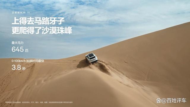 能上马路牙子,不是极氪7X的极限。凭借800V架构,高性能碳化硅电驱,前双叉臂、后五连杆的独立空悬,以及最大可达230毫米的离地间隙,极氪7X成功挑战世界最高沙峰——必鲁图峰,成为全球首款登顶沙漠珠峰的纯电SUV。