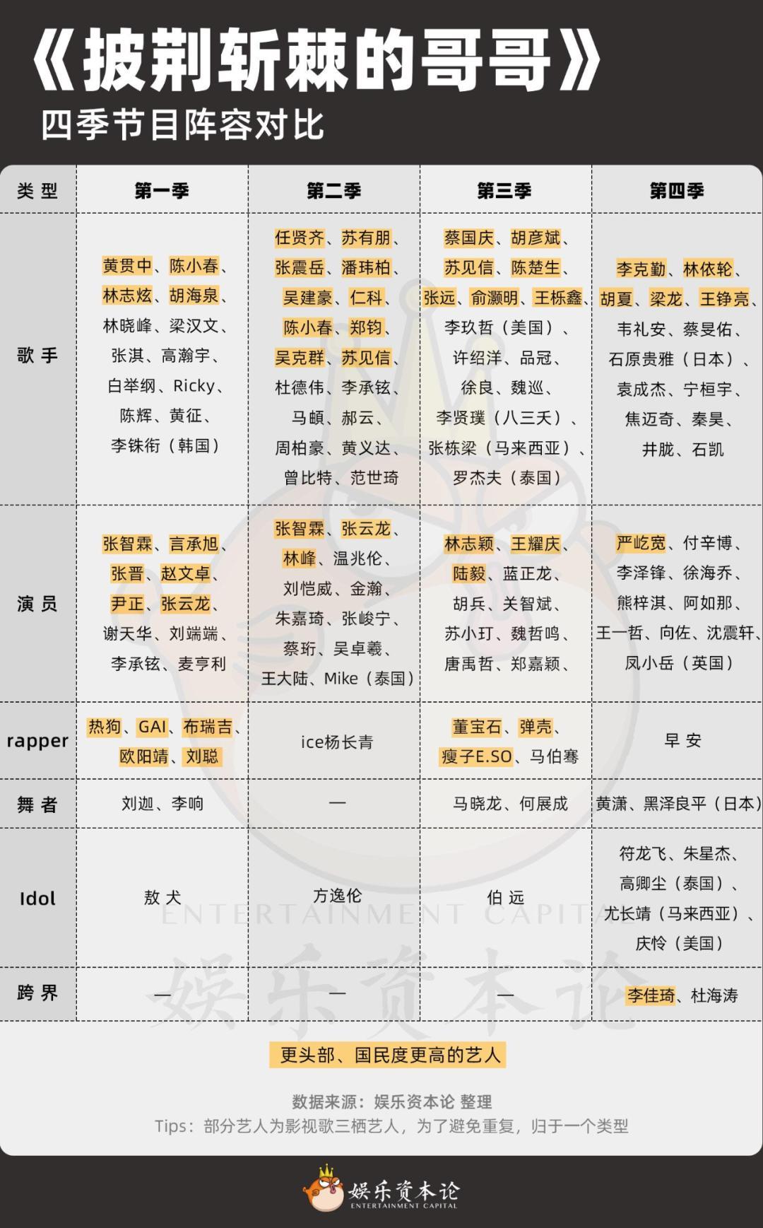 以《披荆斩棘的哥哥》第一季为例,歌手包含了林志炫、胡海泉、黄贯中等艺人,演员有赵文卓、张晋、言承旭、张云龙等,rapper则是热狗、GAI、欧阳靖。