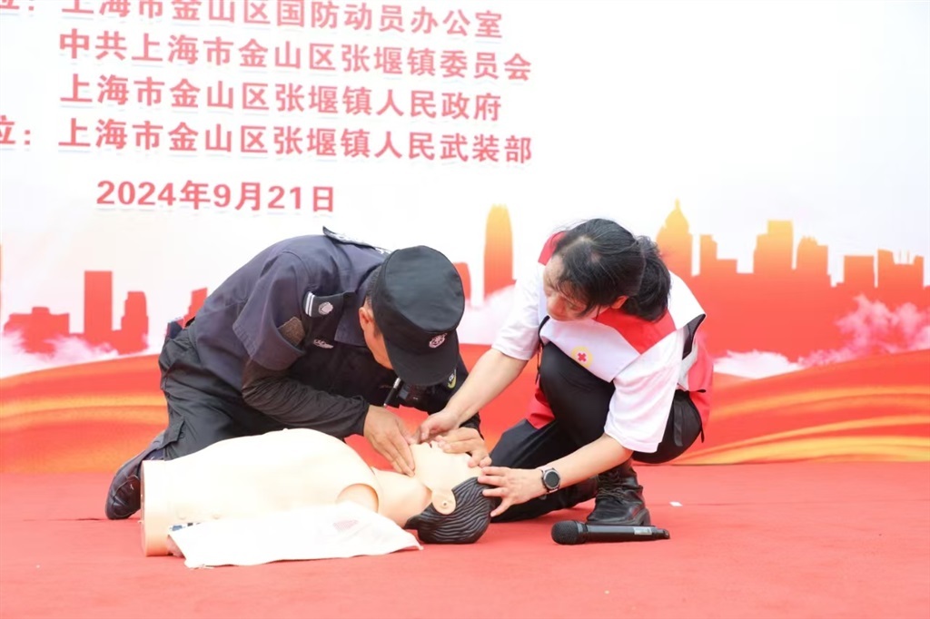除了“实战”环节,演练开始前,金山区红十字会、张堰消防救援站、镇民兵应急连、镇社区卫生服务中心多部门联动,为参演人员开展了人防知识宣讲和知识竞答。“灭火器的使用方法有好记的四字口诀——提拔握压”“大家做心肺复苏时,要注意用掌根部按压,两手叠加、两臂绷直、身体前倾,按压的深度是5-6厘米”……其中包括了防毒面具穿戴、三角巾止血包扎、心肺复苏、灭火器操作等技能培训,并邀请观众上台互动体验,丰富的宣教内容给人留下深刻的印象。