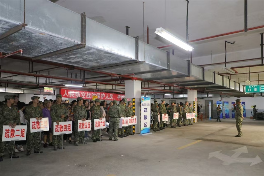 11时45分,空袭警报响起,警用消防烟雾弹同步释放,顷刻间烟雾弥漫,气氛也愈加紧张。演练低拂身姿、捂住口鼻,前后紧跟、步伐紧凑,力争用最快速度完成有序疏散,就近前往位于紫迪兰庭小区内的地下人防工程隐蔽。