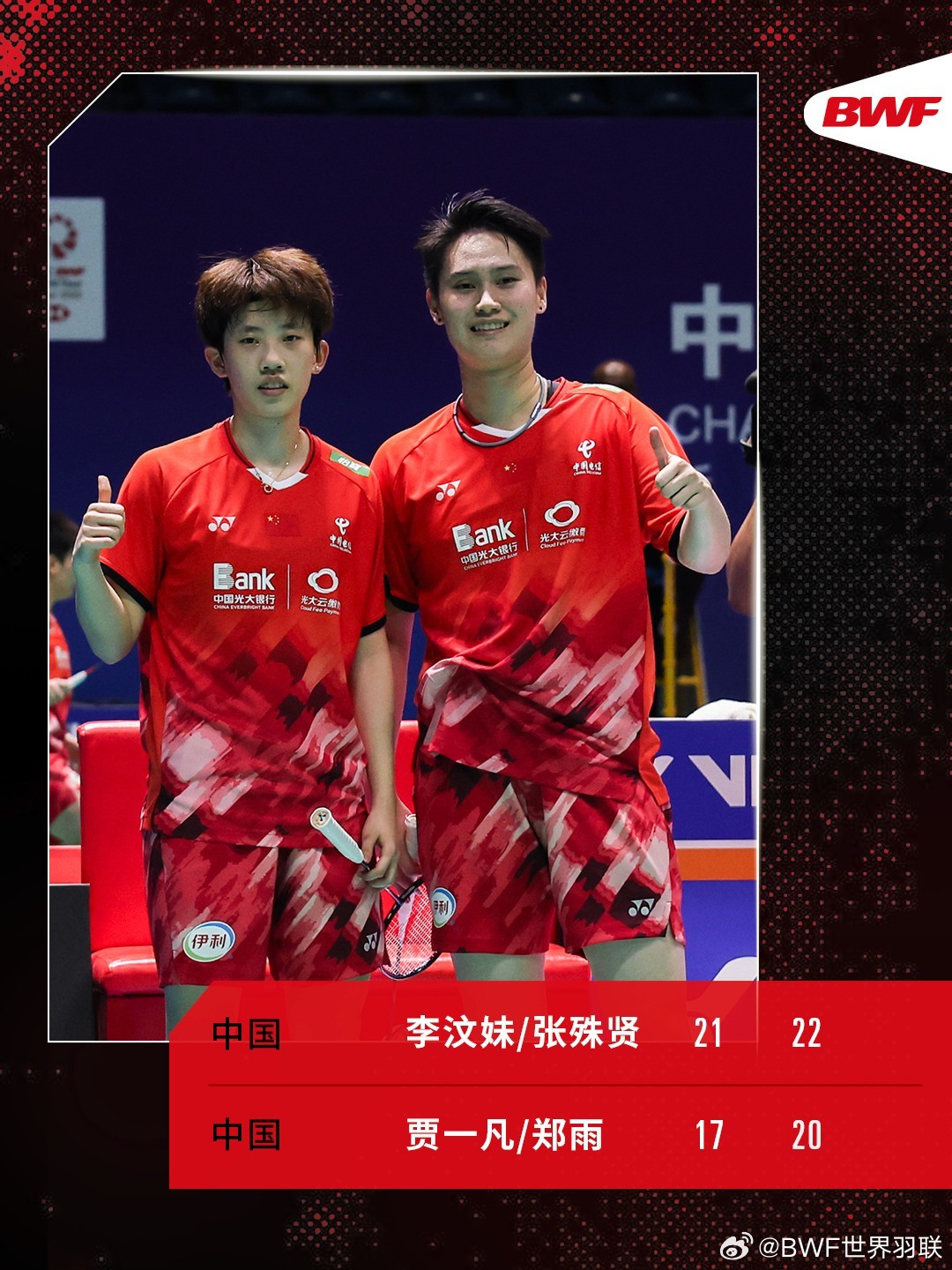 李汶妹/张殊贤将在决赛中对阵李怡婧/罗徐敏,两对中国女双组合来争夺2024年中国羽毛球公开赛的女双冠军。