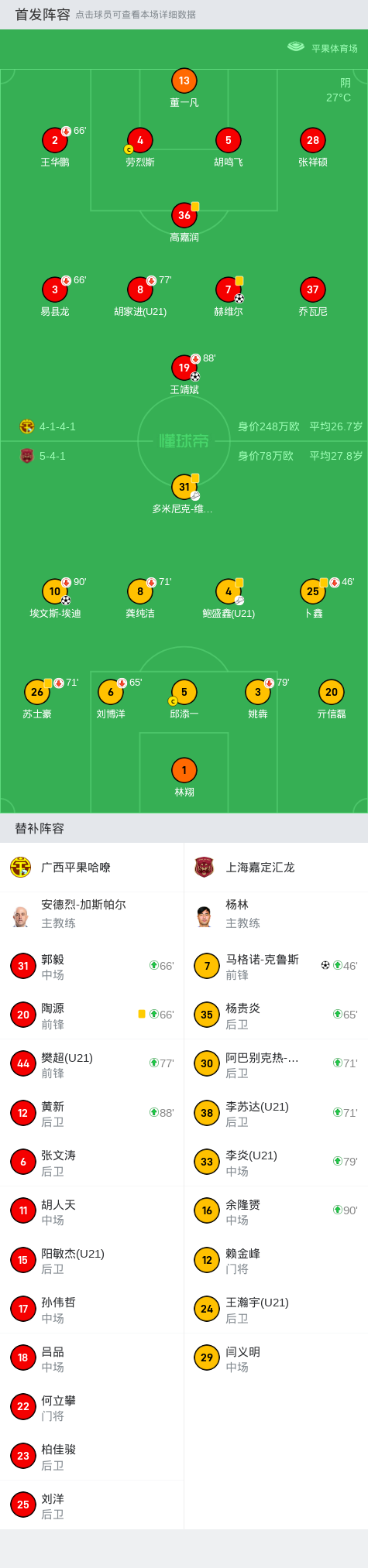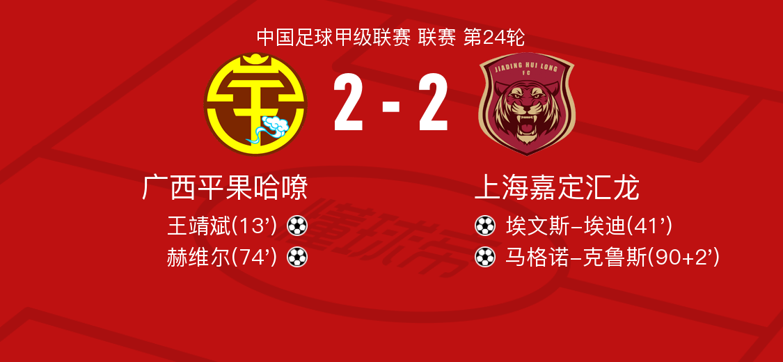 北京时间9月21日,中国足球甲级联赛第24轮,广西平果哈嘹主场迎战上海嘉定汇龙。比赛中,广西平果哈嘹的王靖斌率先破门,随后赫维尔也为球队贡献一球。上海嘉定汇龙方面,埃文斯-埃迪和马格诺-克鲁斯分别取得进球。最终,双方以2-2握手言和。