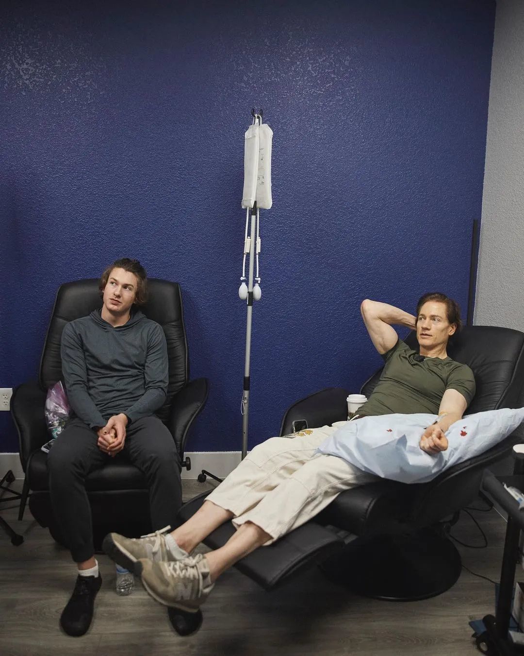 他还拉上祖孙三代尝试“换血”,将17岁儿子的血液输给自己,将自己的血液输给70多岁的父亲,希望通过输入新鲜血液的方式修复受损细胞。