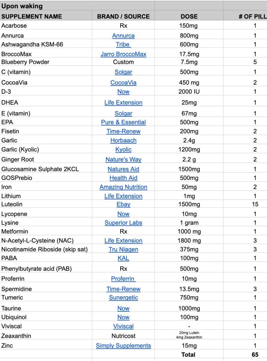 起床后,雷打不动第一件事是服用100多粒补剂药片:维持精力旺盛的牛磺酸、抗氧化的可可黄烷醇、保护眼睛的玉米黄素……最近他的血液铁蛋白含量偏低,因此还额外服用了75毫克铁剂和250毫克维生素C。