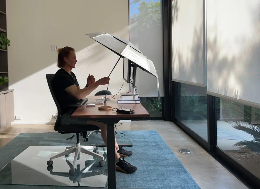 ▲为了最大程度远离紫外线,约翰逊在室内工作时也会打伞