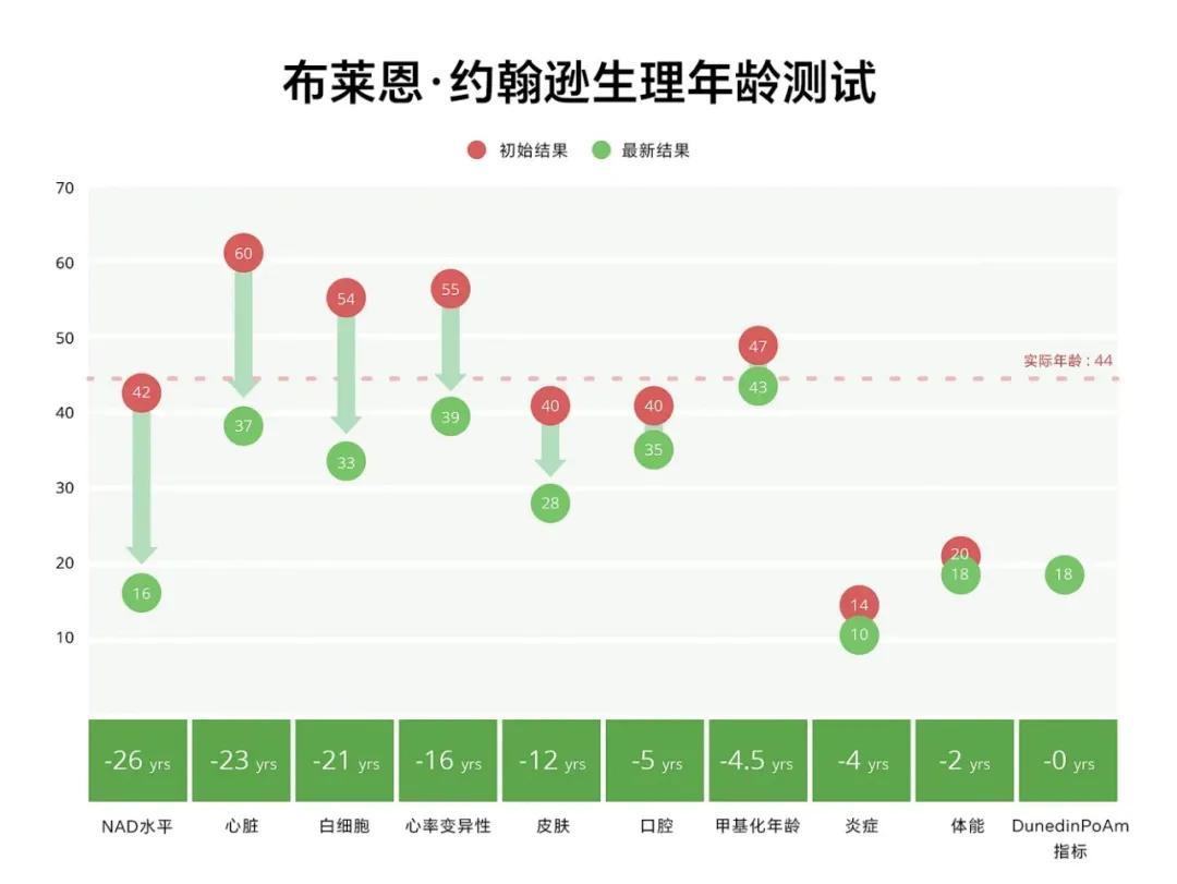 尽管走过弯路,但约翰逊的大部分尝试都有效地减缓了衰老速度。最新的结果显示,他已经打破了逆转年龄的世界纪录——衰老速度比普通人慢34%,低于99%的20岁年轻人。整体年龄年轻了5.1岁。47岁的他,拥有着37岁的心脏、35岁的牙齿、28岁的皮肤与18岁的体能。