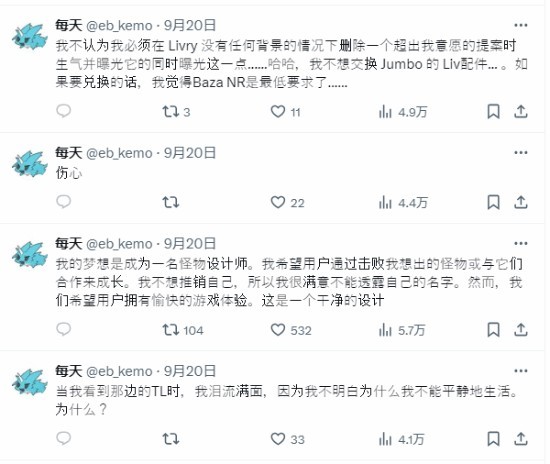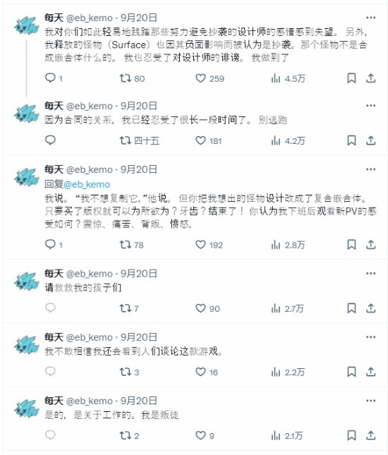 eb_kemo表示自己一直有一个做角色、怪物设计的理想,但在加入《幻兽帕鲁》工作室后,一切都变了:CEO疯狂暗示他抄袭《宝可梦》的设计,自己上交的那些设计草图中,也只有那些一眼看上去就是抄袭《宝可梦》的角色被采用了。