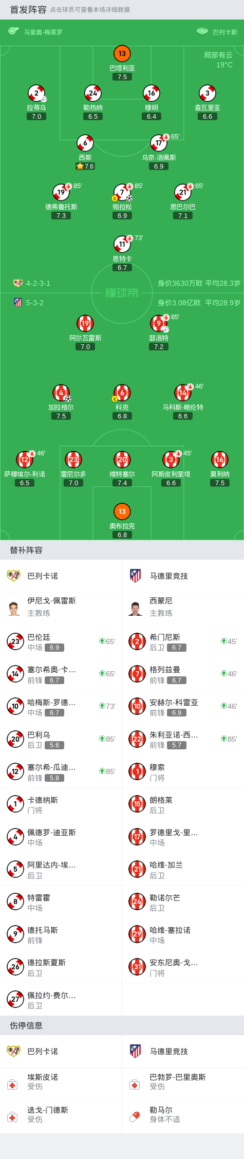 第35分钟,帕拉松门前推射空门破门,巴列卡诺1-0领先马竞