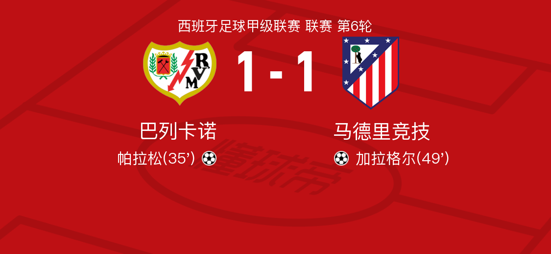 在西班牙足球甲级联赛第6轮的比赛中,巴列卡诺主场迎战马德里竞技。比赛中,巴列卡诺的帕拉松在队友拉蒂乌的助攻下成功破门,为主队先拔头筹。随后,马德里竞技的加拉格尔在瑟洛特的助攻下扳平比分。最终,双方以1-1的比分握手言和。