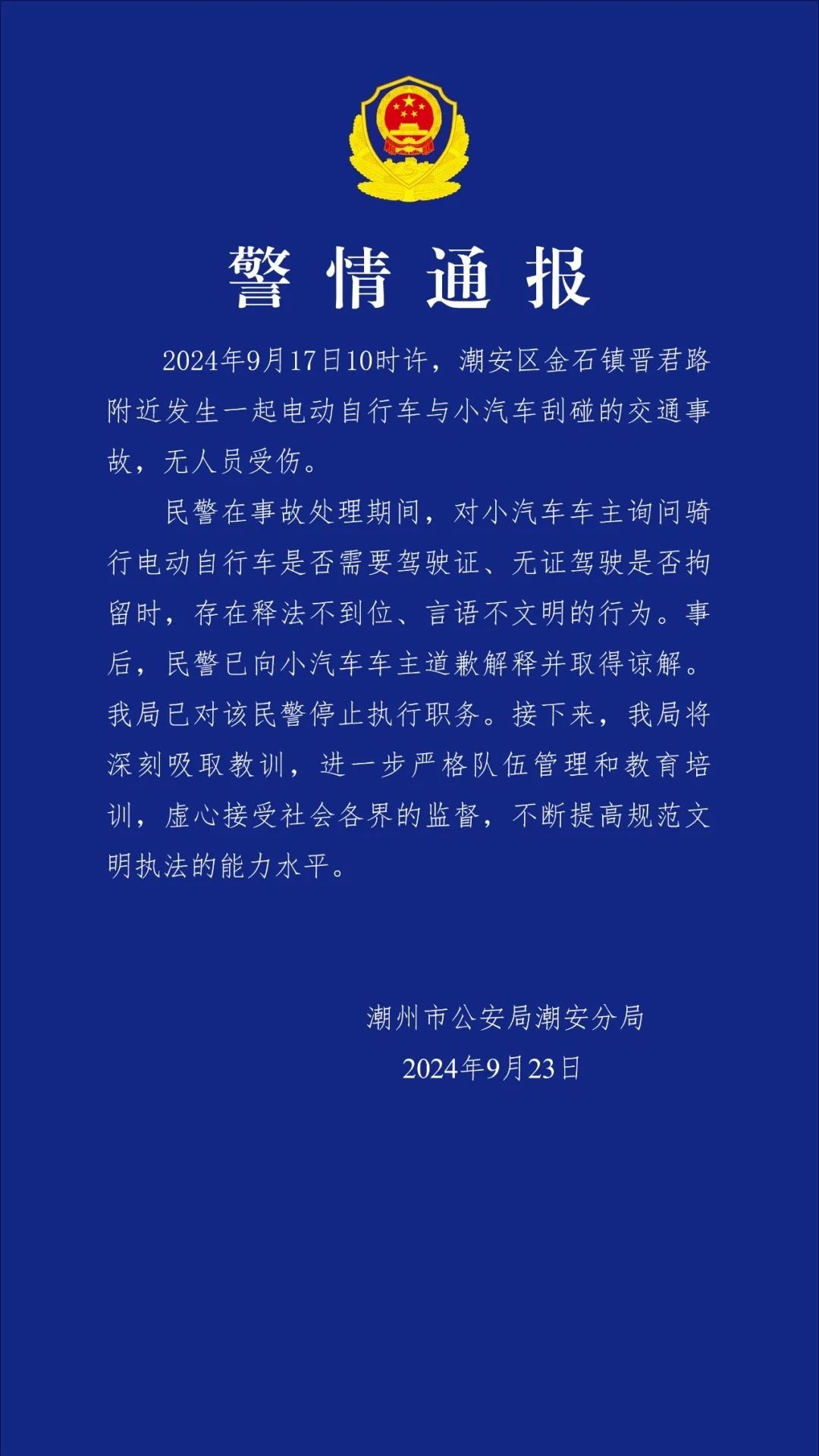 民警在事故处理期间,对小汽车车主询问骑行电动自行车是否需要驾驶证、无证驾驶是否拘留时,存在释法不到位、言语不文明的行为。事后,民警已向小汽车车主道歉解释并取得谅解。我局已对该民警停止执行职务。接下来,我局将深刻吸取教训,进一步严格队伍管理和教育培训,虚心接受社会各界的监督,不断提高规范文明执法的能力水平。