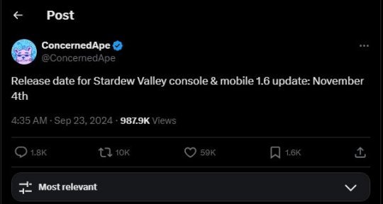 现在,ConcernedApe 终于为广大玩家带来了好消息,在官方推特中简短透露:“《星露谷物语》主机和移动版 1.6 更新发布日期:11 月 4 日”。虽然没有公布具体细节,但对于已经等待了 6 个月之久的玩家来说,再等待一个多月或许并不是件困难的事。