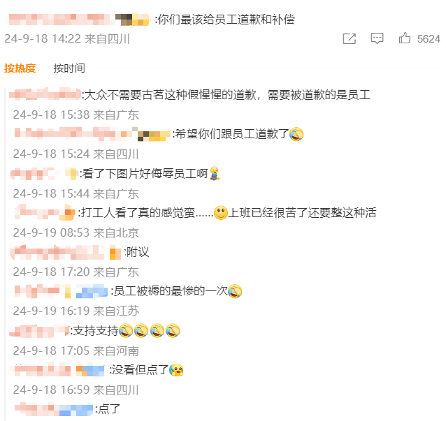 但这则道歉声明并未取得想要的效果,热评第一是“你们最该给员工道歉和补偿”,人们对古茗的避重就轻表示不满,“不要把自己没品位以及不尊重人的想法和行为都归结于玩梗可以吗?”