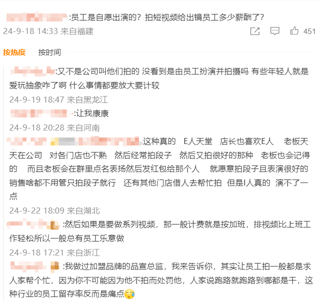有人在评论区质疑员工会不会是自愿参与拍摄,这种言论被网友贴脸开大“那就祝你以后找工作遇到这样的”“刀不割在自己身上不知道疼,又在这儿慷他人之慨了”。