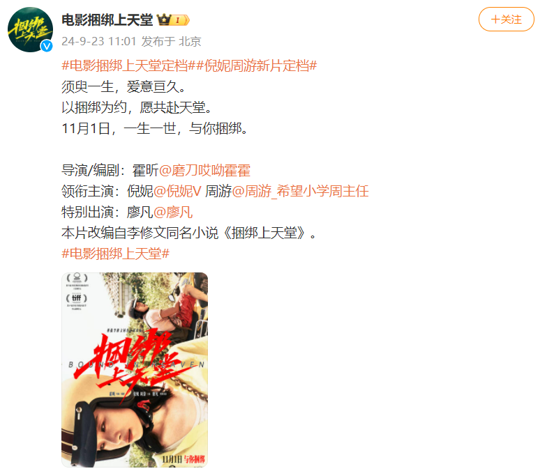 9月23日,电影《捆绑上天堂》官方发布定档海报,官宣将于11月1日全国上映。