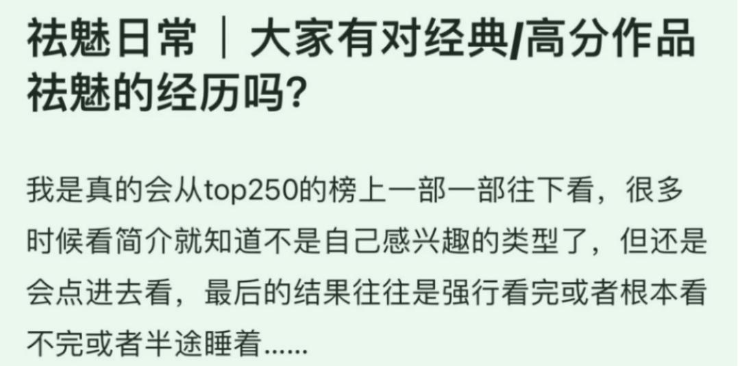 豆瓣是日常祛魅,凡所有相,皆可祛魅。对大房子、对相机、对天菜,甚至是没有惹到任何人的MBTI都可以祛魅。“今天也祛魅了”小组拥有10000+组员,每天分享千奇百怪的祛。搞得硬糖君很想来个祛中祛:对小说人设祛魅嫌刻板,这是还没遭过真人影视的荼毒!对MBTI祛魅,那是把自己的惰性思维怪到模型上了。