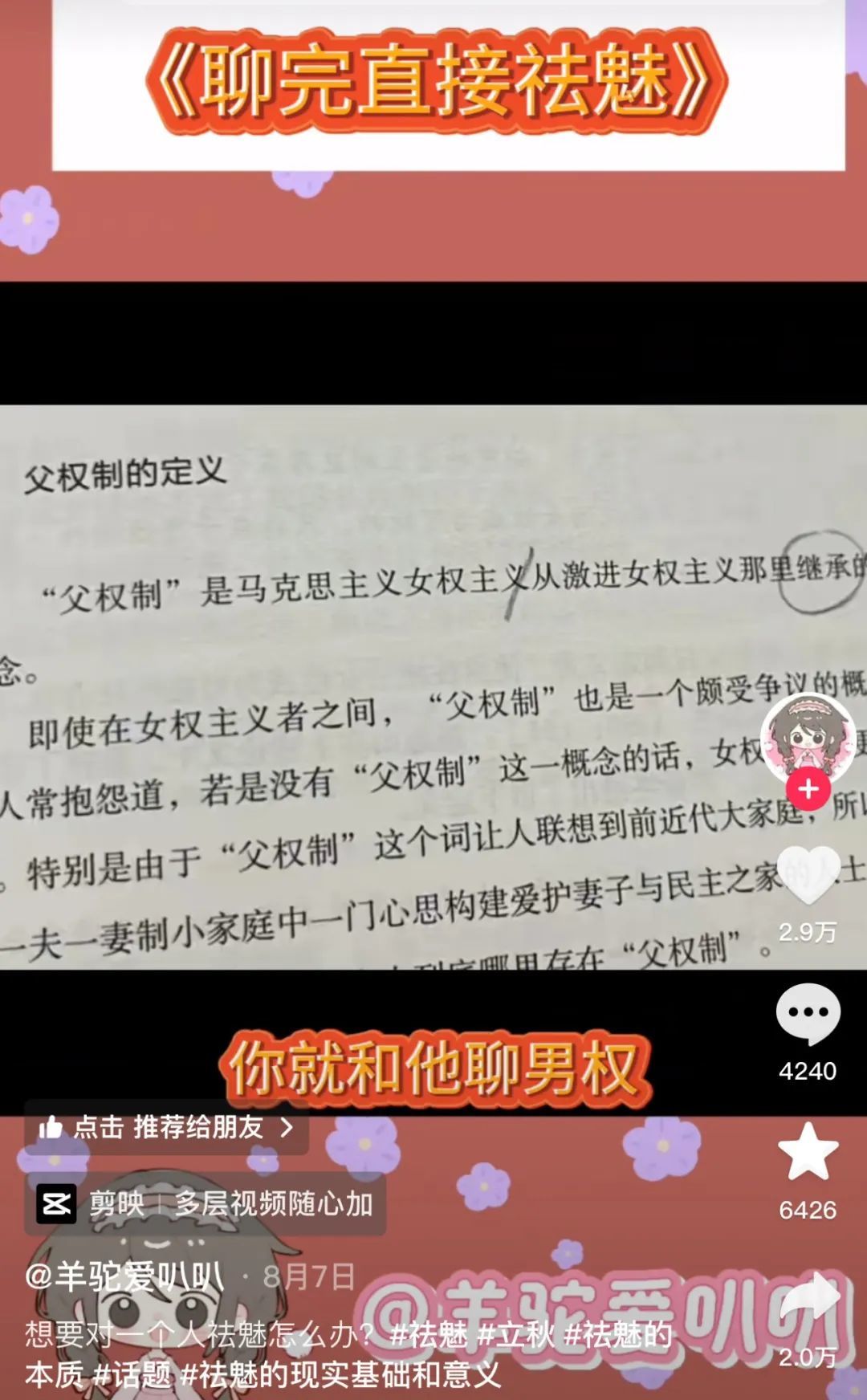 抖音则专注情感祛魅,各种情专和营销号每天教你对异性祛魅。“即便你眼前这个人是现阶段你认知总和里的最优解,你也不会喜欢太久。”情专心碎小K以苦口婆心的劝说风格涨粉,他认为“一个男的条件再好,没用到你身上,关你屁事!”转头心碎小K就被女友爆出轨和无缝衔接。