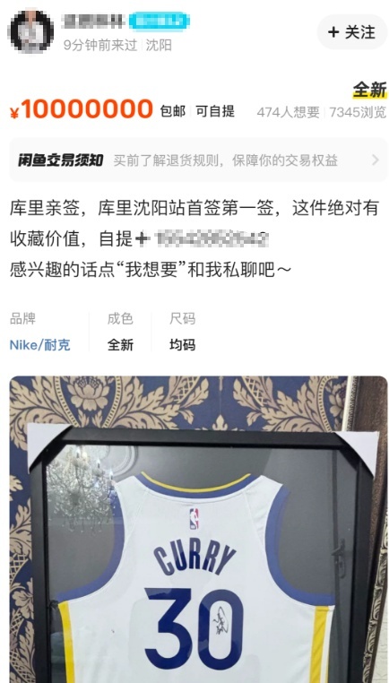 9月10日,NBA球星库里开启中国行,来到成都、西安、沈阳、上海等城市与球迷互动。其中在沈阳站,一名球迷获得库里该站首件签名球衣后激动呐喊落泪,引发关注。近日,有网友发现,该签名球衣已被挂在二手闲置平台上售卖。