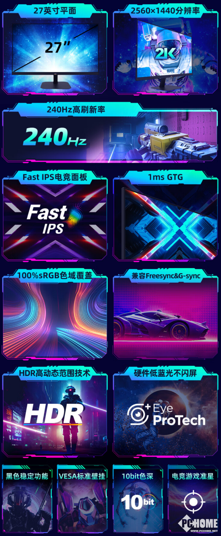 该款显示器采用一块27英寸的Fast IPS面板,色深为10bit(8bit+FRC),可视角度为178度(水平和垂直),显示比例为16:9,分辨率为QHD/2K(2560 x 1440),刷新率为240Hz,响应时间(GtG)为1ms,典型亮度为350尼特,典型对比度为1000:1,sRGB色域为100%,DCI-P3色域为93%,支持HDR10,兼容AMD FreeSync和NVIDIA G-Sync,消除画面撕裂卡顿,让游戏流畅且稳定。由于采用DC调光加上滤蓝光功能,降低屏幕闪烁并带来了更舒适的显示。