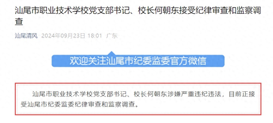 9月23日,据汕尾清风:汕尾市职业技术学校党支部书记、校长何朝东涉嫌严重违纪违法,目前正接受汕尾市纪委监委纪律审查和监察调查。