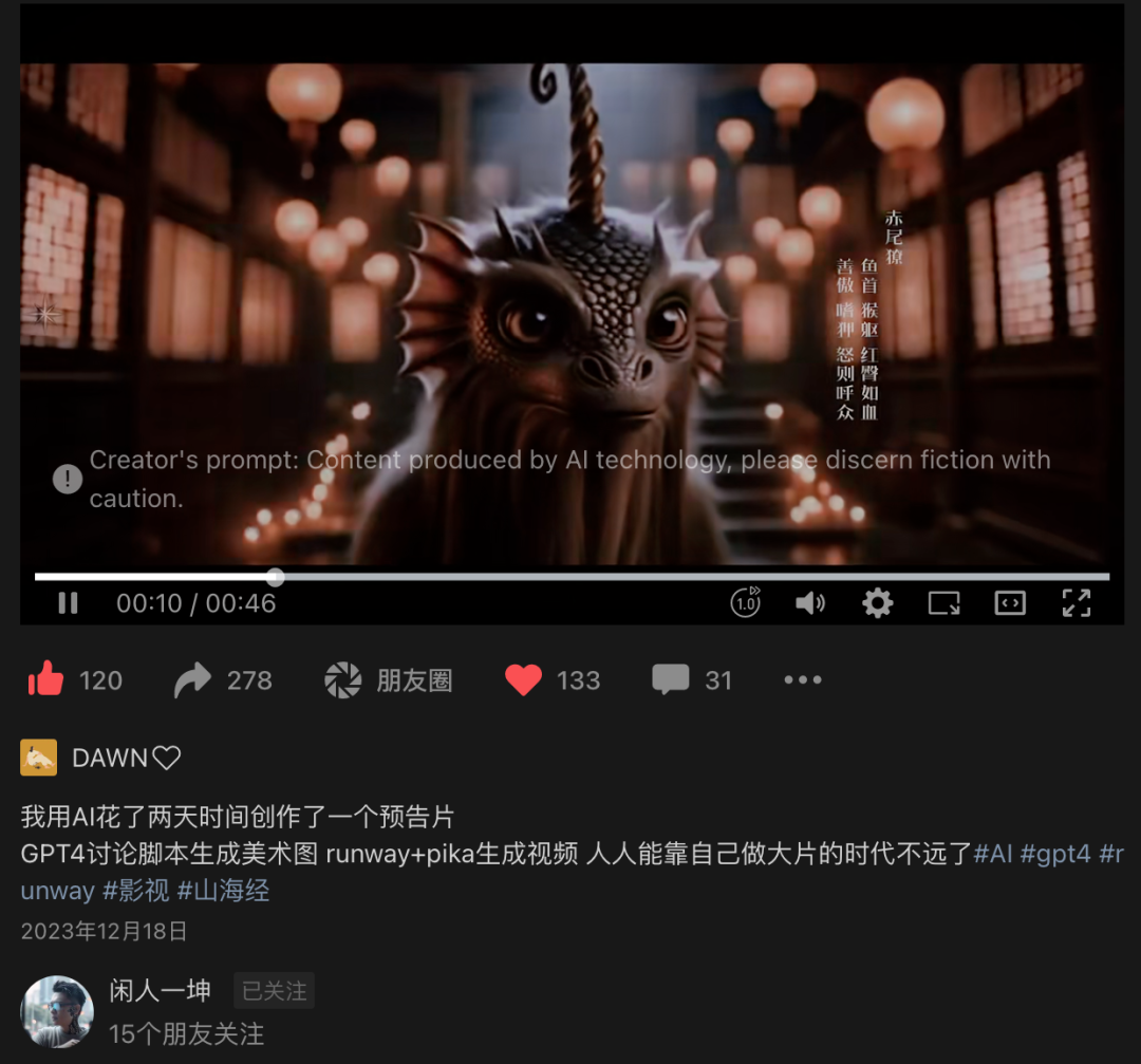 2023年12月,从业20余年的影视从业者、“星贤文化”创始人陈坤(网络ID:闲人一坤)用AI工具生成了一个山海经题材的电影预告片,引发了行业热议。在简介中他写道“人人都能自己做大片的时代不远了”。