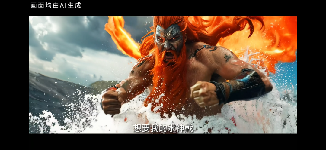 剧里有一个水神和火神打架的画面,我们换不同的提示词跑了100多遍,最后结果还是不完美,但是我还是把它放进去了。