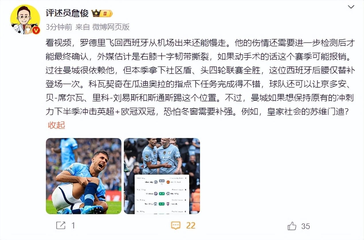 对于罗德里的伤势,评论员詹俊表示:看视频,罗德里飞回西班牙从机场出来还能慢走。他的伤情还需要进一步检测后才能最终确认,外媒估计是右膝十字韧带撕裂,如果动手术的话这个赛季可能报销。过往曼城很依赖他,但本季拿下社区盾、头四轮联赛全胜,这位西班牙后腰仅替补登场一次。科瓦契奇在瓜迪奥拉的指点下任务完成得不错,球队还可以让京多安、贝-席尔瓦、里科-刘易斯和斯通斯踢这个位置。不过,曼城如果想保持原有的冲刺力下半季冲击英超+欧冠双冠,恐怕冬窗需要补强。例如,皇家社会的苏维门迪?