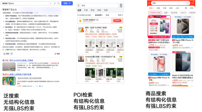 行业内不同搜索场景有不同业务特性,下图为百度搜索,美团搜索,淘宝搜索场景的示例。对于网页搜索偏向于泛搜索,内容无结构化信息。对于餐饮和商品搜索,则偏向垂类搜索,其内容有结构化信息。