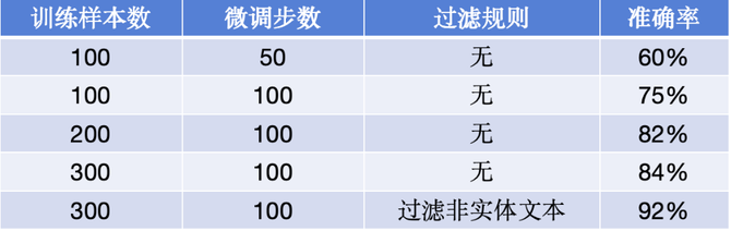 随着微调数据量提升,准确率有所提升:此处过滤非实体文本规则是根据 badcase 定制业务规则