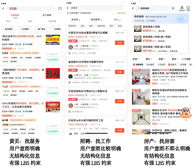 对应 58 同城商业搜索场景,不同业务之间略有差异。整体上,因为是同城业务,都有强 LBS 约束,用户大部分场景只搜索所在城市的服务。对于黄页场景,因为用户来找服务,目标意图非常明确,相关性要求会比较高,同时商家内容为文本加图片信息,无结构化信息。对于招聘场景,用户来找工作,目标意图相对较明确,但可以给其推荐类似的工作,因此是搜索加推荐场景。对于房产业务,用户在不同找房阶段,目标不同,因此其意图可能发生变化,也是搜索加推荐场景。