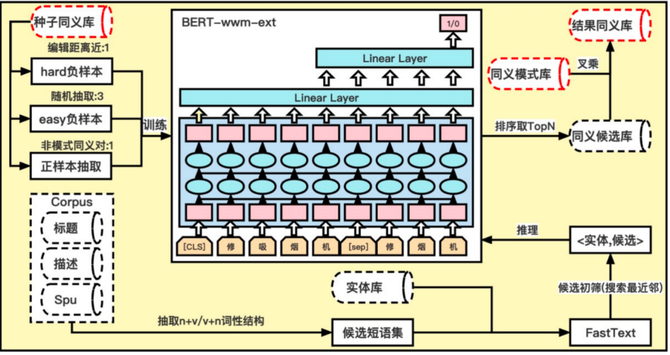 方案:训练时,人工标注的同义对作为正样本,随机抽样实体对作为负样本,通过 Bert 模型同义对分类模型;推理时,先从实体库中用 fasttext 粗筛一批候选同义对,再经过训练好的 Bert 模型,根据阈值取 TopN