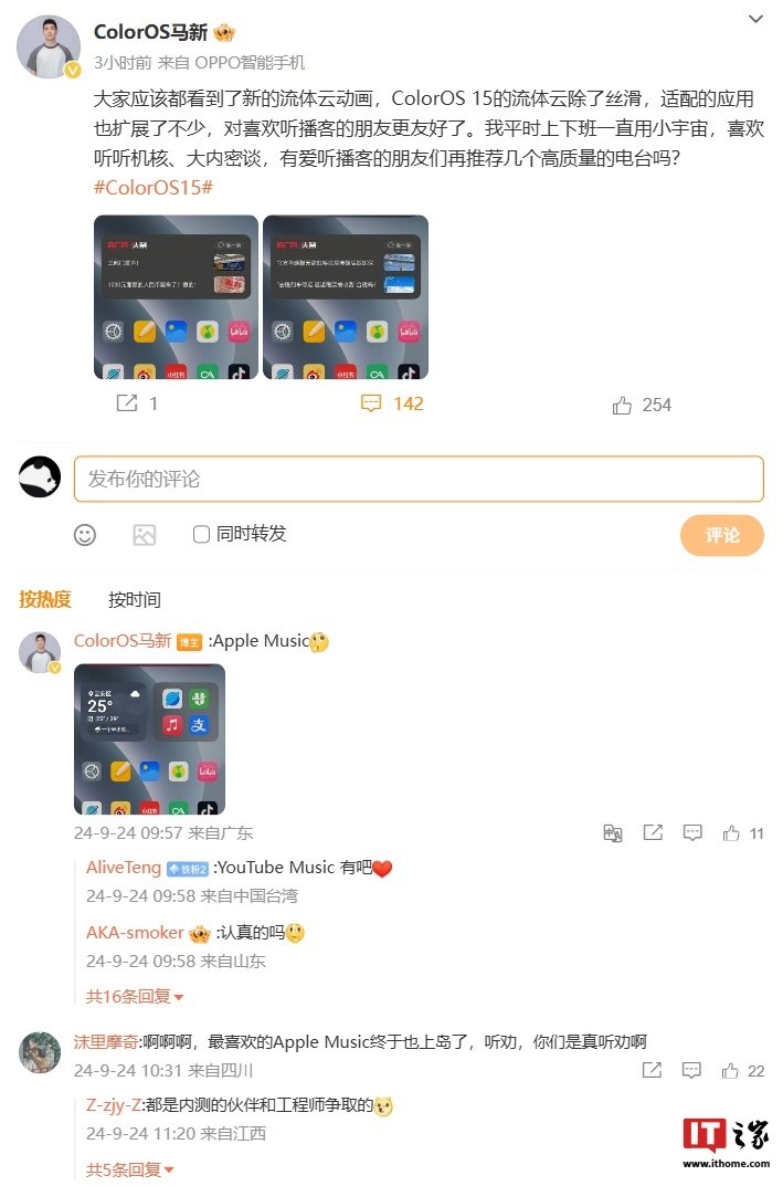 OPPO ColorOS 用户体验与解决方案总监马新今日发文透露, ColorOS 15 流体云适配应用得到拓展,新增 Apple Music、播客类 App(目前公布应用为“小宇宙”)等。