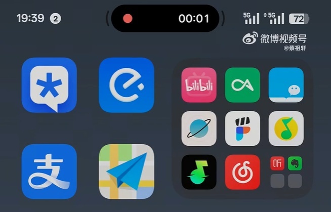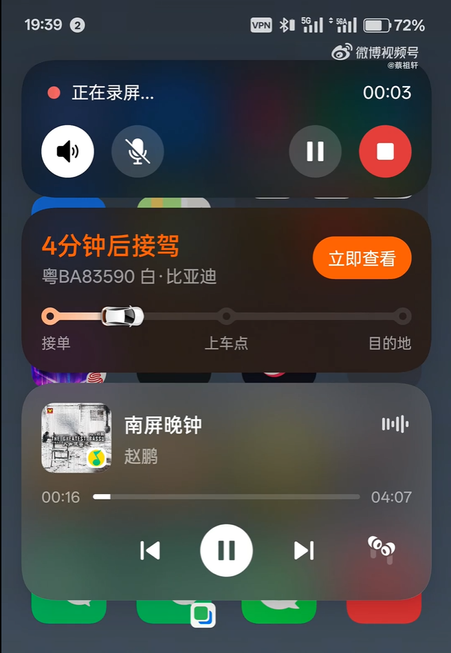 据此前报道,一加员工 @蔡祖轩 在微博上公开了 ColorOS 15 流体云的演示。该功能的位置改为居中放置,类似苹果的“灵动岛”,演示中出现了录屏、音乐播放以及打车软件的界面。