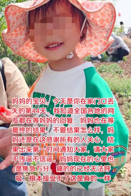 在警方发布通报前3个多小时,女童的妈妈发文称:十月,妈妈的宝贝,今天是你在家门口丢失的第44天,从昨天到现在妈妈也一直在等结果。我知道全国各地的网友都在等,不管怎么样,还是谢谢你们对十月的关心,结果出来会第一时间告诉大家。请大家不信谣不传谣,等待结果,妈妈现在也是焦急万分,心痛的已经没有办法呼吸,根本无法接受。