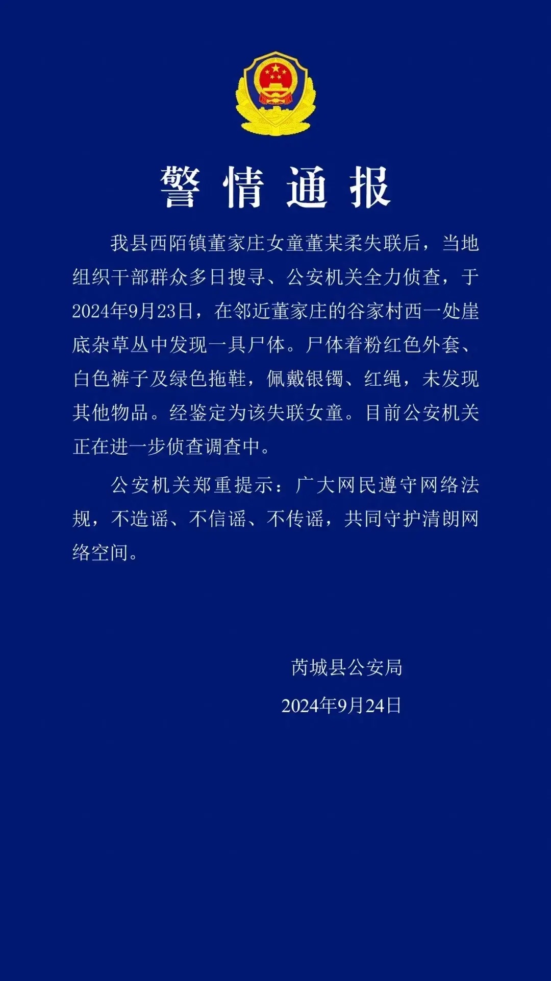 9月24日,芮城公安发布警情通报称,23日,在邻近董家庄的谷家村西一处崖底杂草丛中发现一具尸体。尸体着粉红色外套、白色裤子及绿色拖鞋,佩戴银镯、红绳,未发现其他物品。经鉴定为该失联女童。目前公安机关正在进一步侦查调查中。