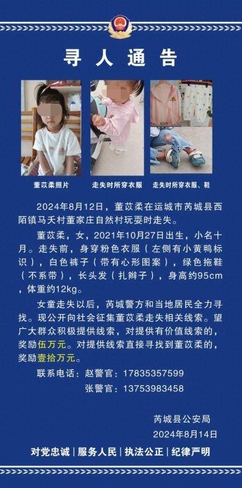 8月12日,山西芮城一2岁女童董苡柔(小名十月)在家中失踪,引发社会关注。