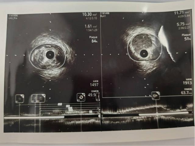 为了深入评估曾先生的血管病变情况同时让支架精准定位,在征得患者家属同意后于2024年9月13日为患者实施了冠脉内超声检查+冠脉内支架植入术。