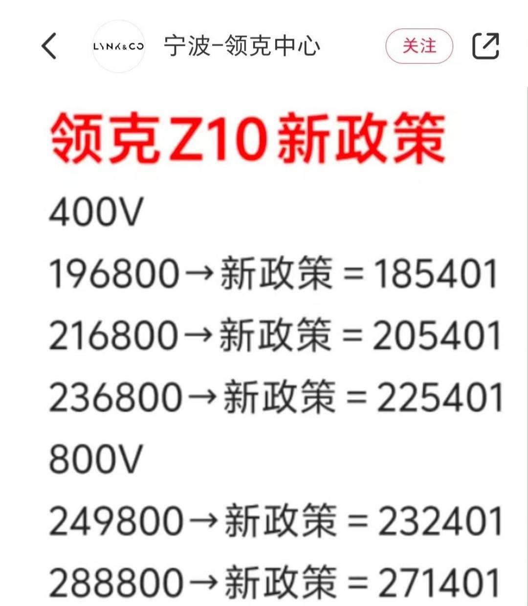 在发布会的第二天,就有多位网友发帖称领克Z10各车型在线下门店都有1万到1.6万元的降价,比如入门款由19.68万元下降至18.54万元,顶配车型由28.88万元下降到27.14万元。