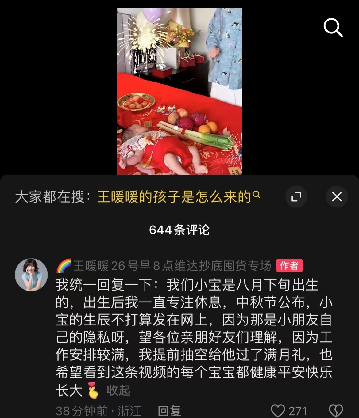 对此,王暖暖在评论区回应:“我们小宝是八月下旬出生的,出生后我一直专注休息,中秋节公布,小宝的生辰不打算发在网上,因为那是小朋友自己的隐私呀,望各位亲朋好友们理解,因为工作安排较满,我提前抽空给他过了满月礼。”