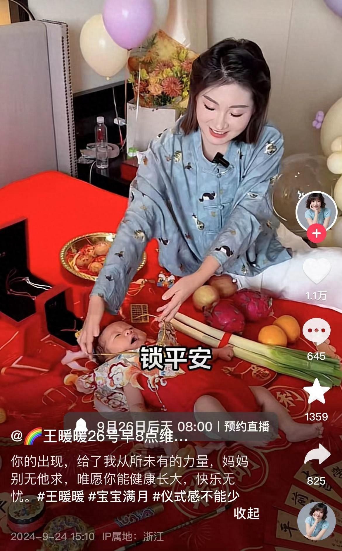 视频中,王暖暖称呼儿子为“源源小朋友”,为他戴上金手镯、金锁,还理胎发、封酒,仪式感满满。