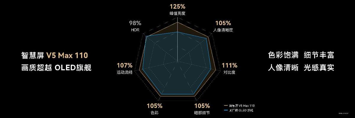 华为智慧屏 V5 Max 110厚积薄发,配备了超凡的Super MiniLED屏幕——华为黑钻屏,该屏幕采用黑钻聚能SuperMiniLED、多晶量子点膜、黑钻超维场液晶技术、黑钻全景臻彩液晶补偿、纳米复合低反膜等技术手段,使得显示屏拥有了高亮度、高色域、高对比、广视角、超低反射五大核心优势。华为智慧屏 V5 Max 110精确控光分区,峰值亮度达到5000nits,在强光环境中屏幕上的内容依然清晰可见。DCI-P3 125%、BT2020 91%的超广色域,加上日本前索尼专家调优、自动PQ调试调色,带来电影级的显色能力。
