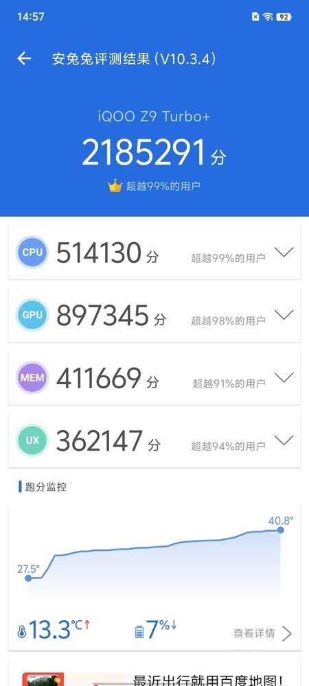 实测显示,iQOO Z9 Turbo+的安兔兔跑分达到了218万分,超越了99%的用户,其中,CPU跑分514130,GPU跑分897345,MEM跑分411669,UX跑分362147。而且,为了让Z9 Turbo+拥有更为出色的游戏体验,iQOO还为其配备了一颗自研电竞芯片Q1,双芯加持配合蓝厂对天玑的调校,游戏体验非常出色。