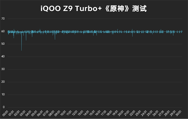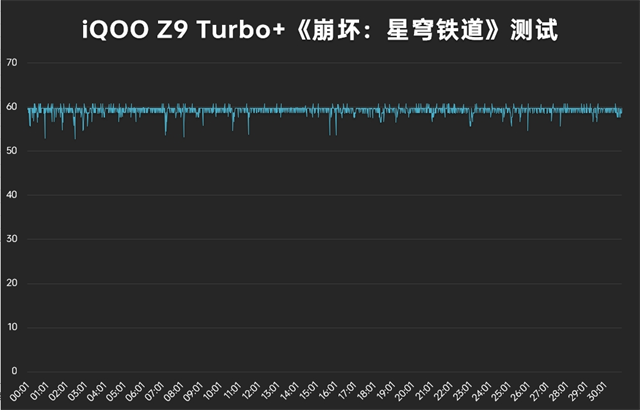 而在《崩坏:星穹铁道》的测试中,同样是选择最高画质开启60fps模式,并且在星槎海中不断移动,可以看到,对于iQOO Z9 Turbo+来说,应对它也不成问题,经过半个小时的测试,平均帧率59.3,流畅度达到了98.97,可以从图表中看到帧率还是非常稳定的,真的是《崩坏:星穹铁道》也稳了。