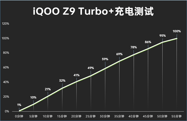 只有大电池还不够,当然还需要快充,iQOO Z9 Turbo+采用了80W超级闪充,经过我们实测,从1%充至100%仅需55分钟,作为一个6400mAh的大电池来说,这个速度非常不错了,并且值得一提的是,它还支持第三方55W PD&PPS快充,如果愿意牺牲点充电速度的话,能够获得一个不错的充电兼容,也是一种选择。