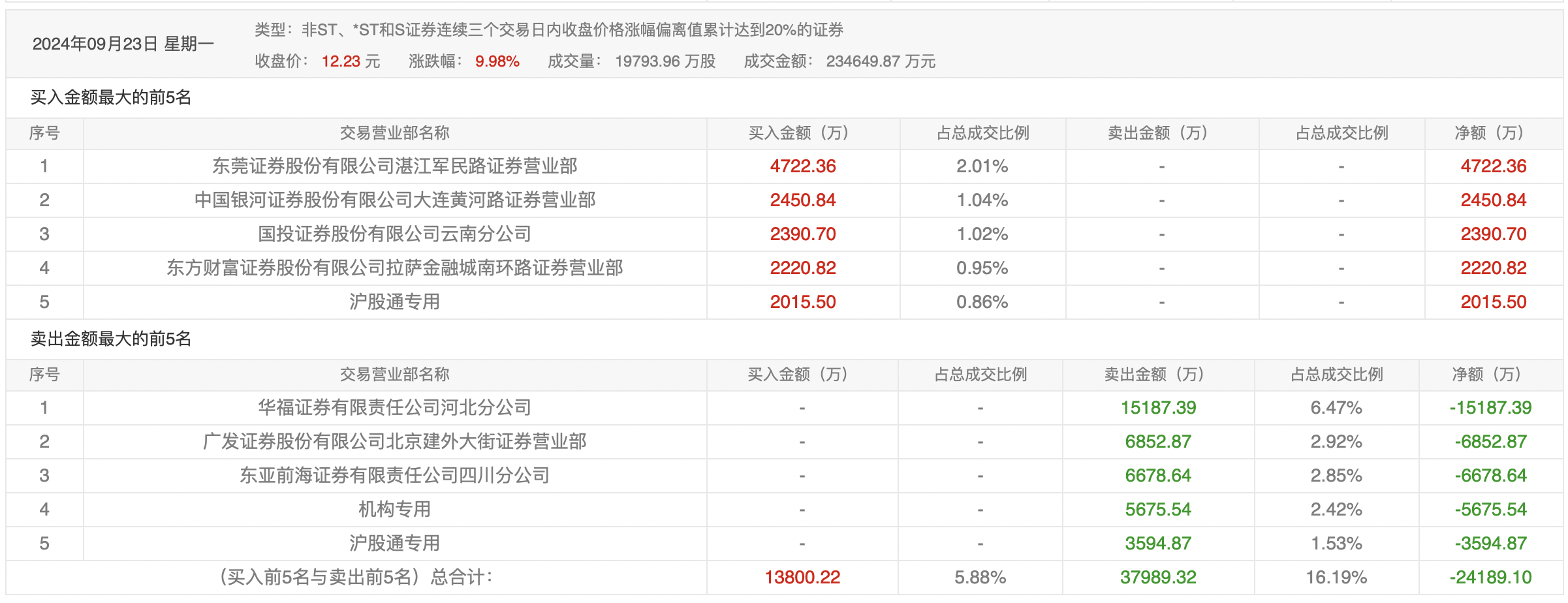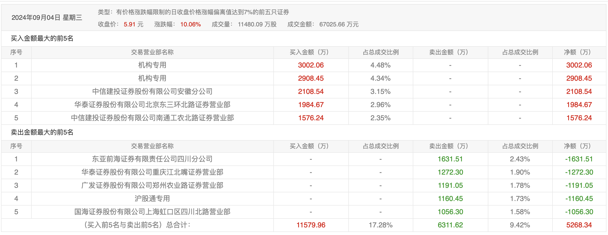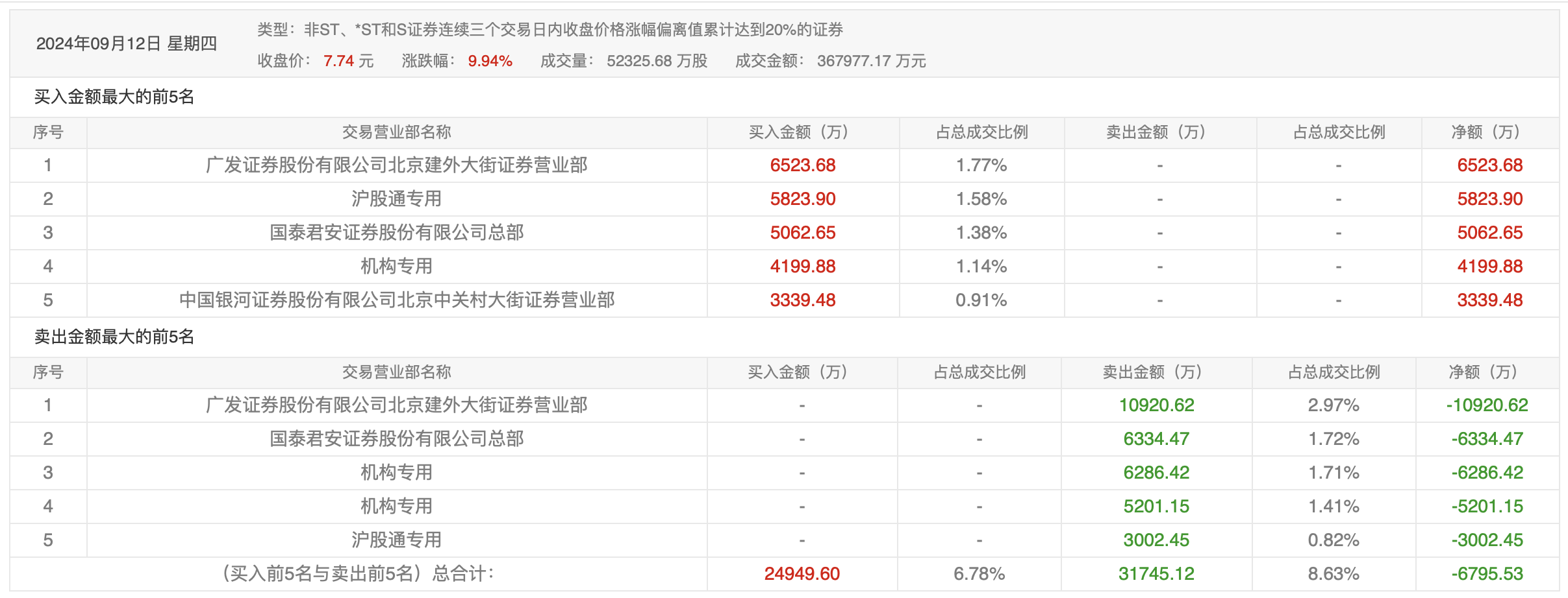 9月12日的龙虎榜数据显示,前五资金以卖出为主,此前较为活跃的广发证券北京建外大街证券营业部在买入6523.68万元的同时,又卖出1.09亿元。两家机构合计卖出1.15亿元。沪股通专用席位买入5823.90万元,卖出3002.45万元。