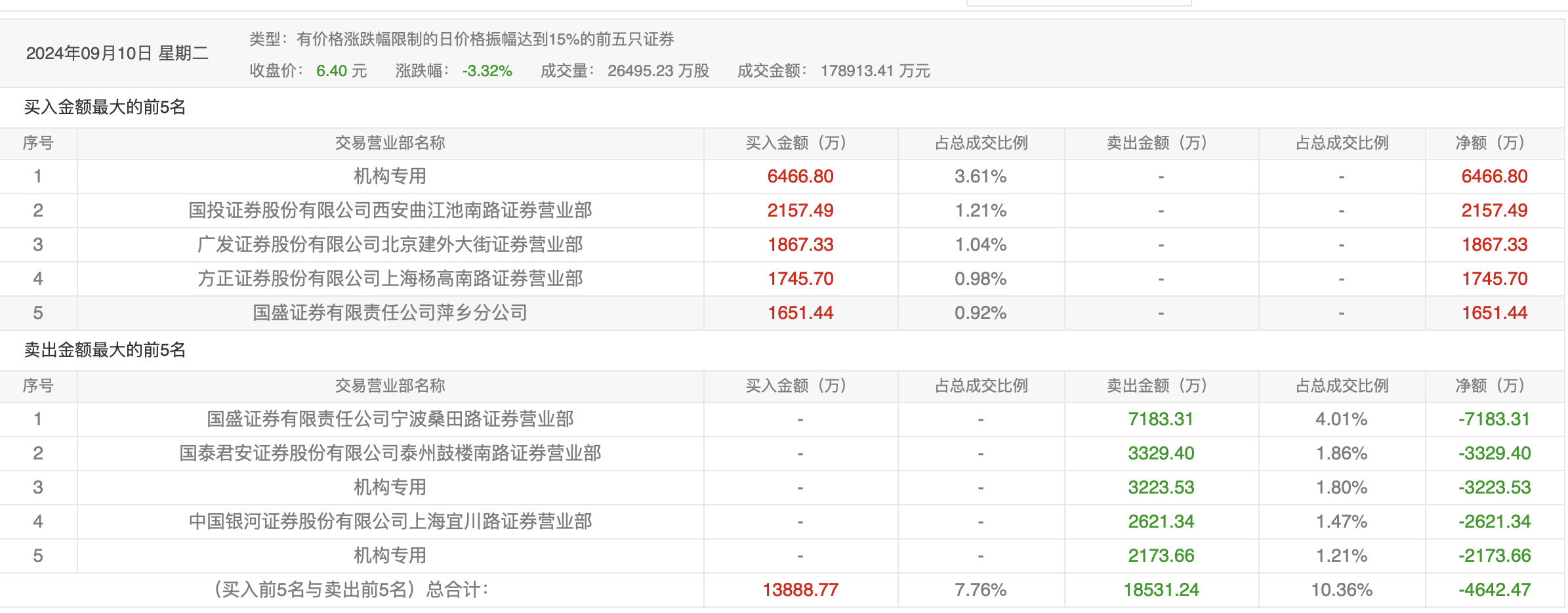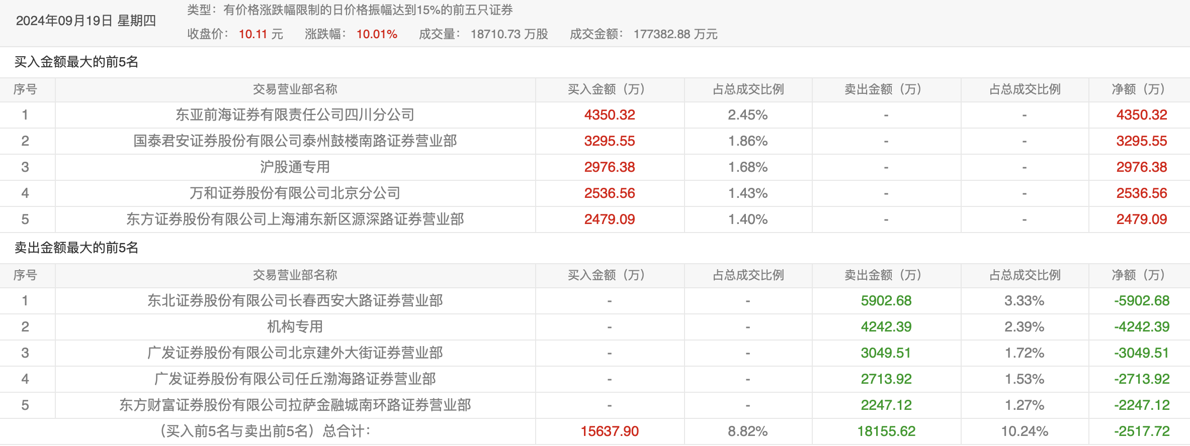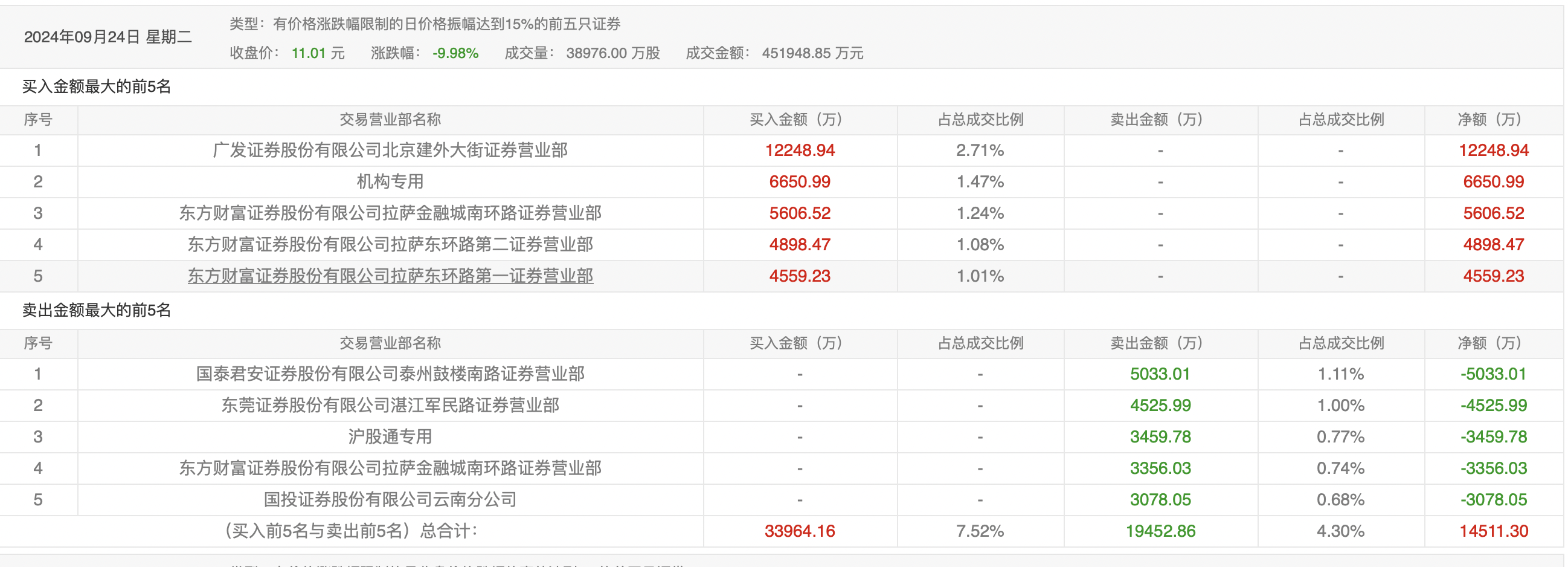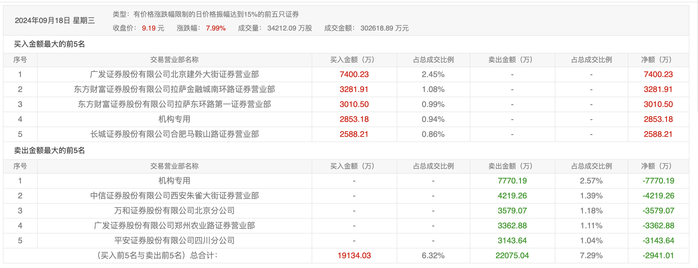 9月12日的龙虎榜数据显示,前五资金以卖出为主,此前较为活跃的广发证券北京建外大街证券营业部在买入6523.68万元的同时,又卖出1.09亿元。两家机构合计卖出1.15亿元。沪股通专用席位买入5823.90万元,卖出3002.45万元。