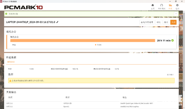 电池续航方面,华硕灵耀14 Air虽然机身轻薄,但还是塞进了72Wh容量的长寿电池,在PCMark10的现代办公电池续航测试中(安静模式,Windows最佳能效,Wi Fi蓝牙开启,屏幕亮度60%),最终测试成绩为20小时11分钟,这个续航如果你再想以笔记本没电为由摸鱼是不可能的了,移动办公再无压力。
